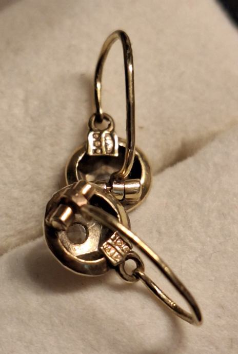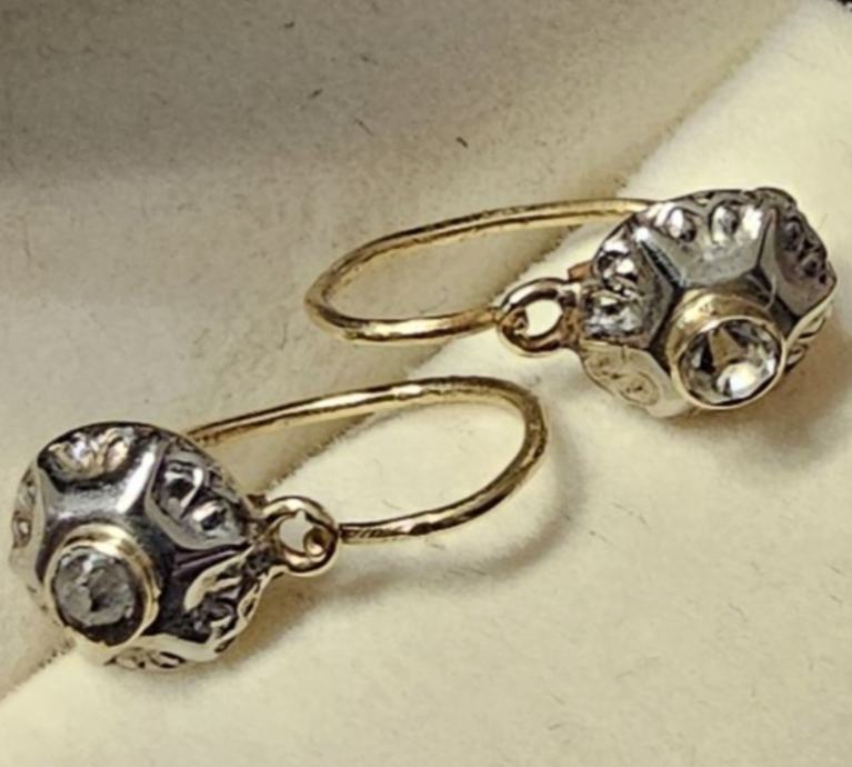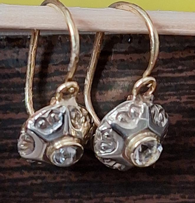 Starinske naušnice, bijelo i žuto zlato sa dijamantima. Imaju oznaku za zlato 585 na kopči, vidljivo na slici.