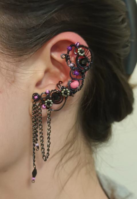 Ukras za uho ili earcuff izrađen od crne aluminijske žice I staklenih perlica.