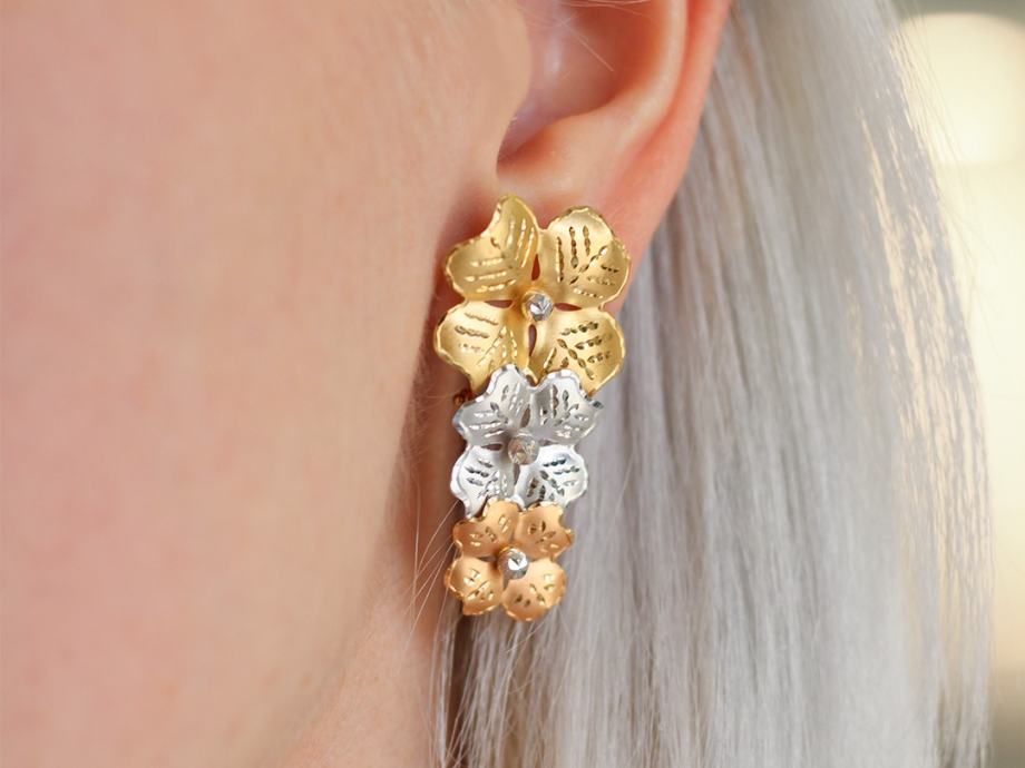 Procvjetajte u stilu uz ove naušnice s tri nježna cvijeta u bijelom, žutom i roze zlatu!