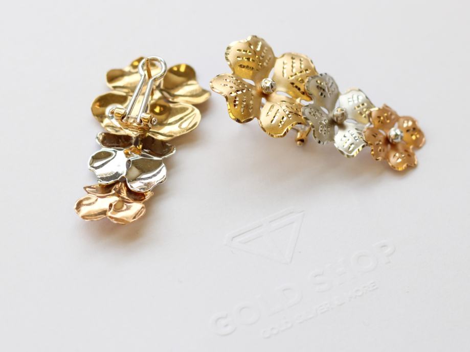 Zlatne poluviseće (klik) naušnice, cvijetići žuto - bijelo - crveno zlato, 18K, štambilj 750.