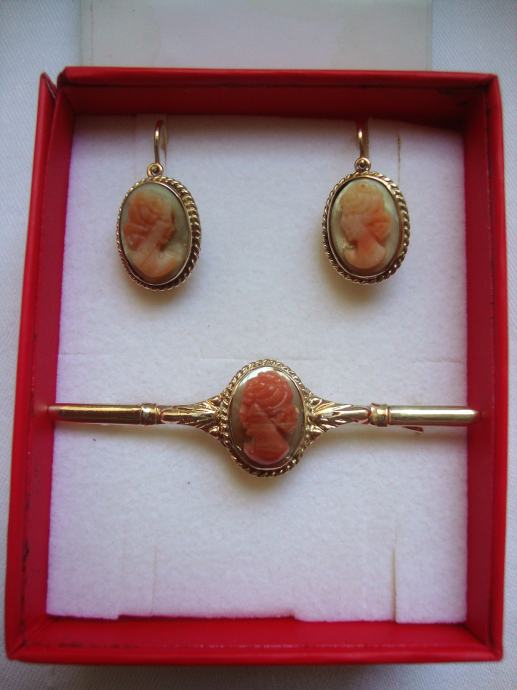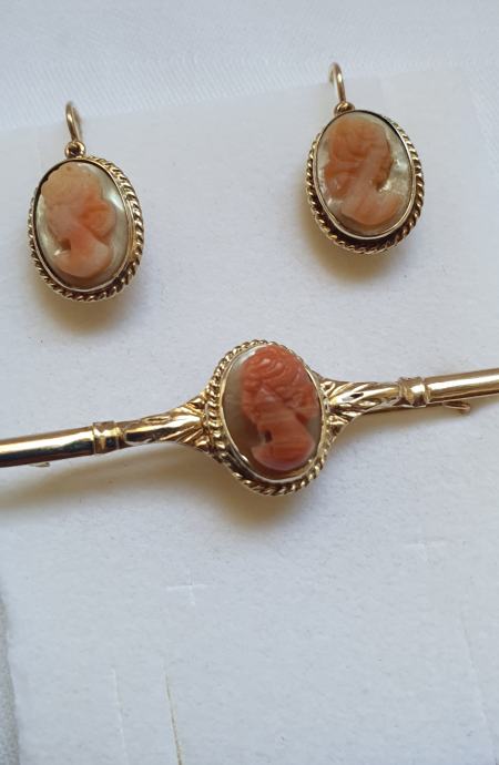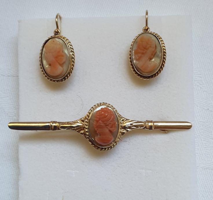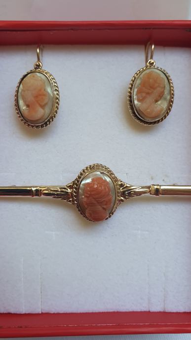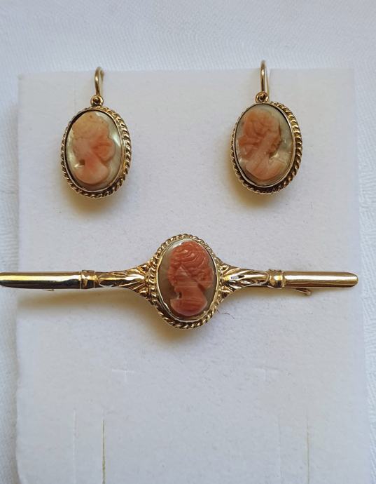 ZLATNE NAUŠNICE I BROŠ KORALJ - STARINSKI KOMPLET 14kt ZLATO 585