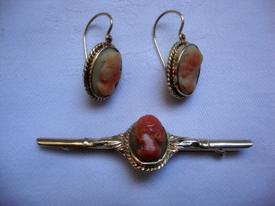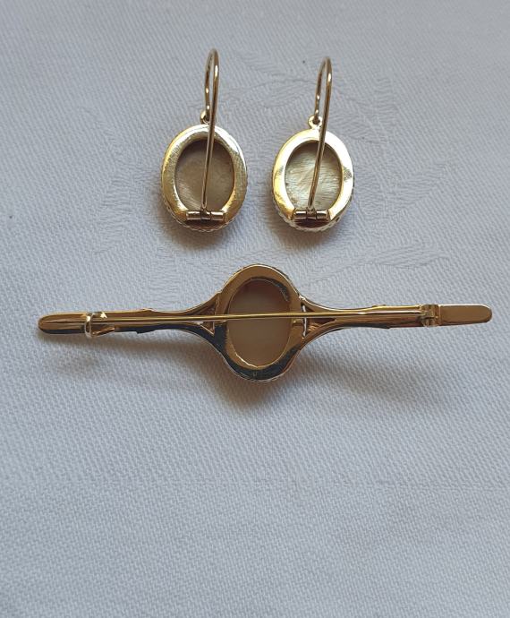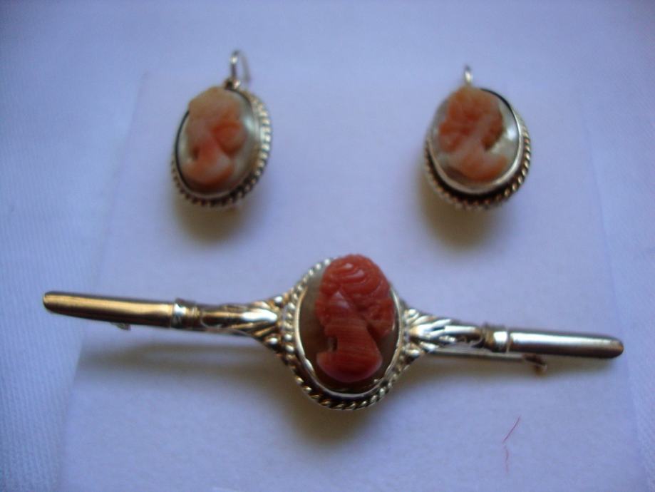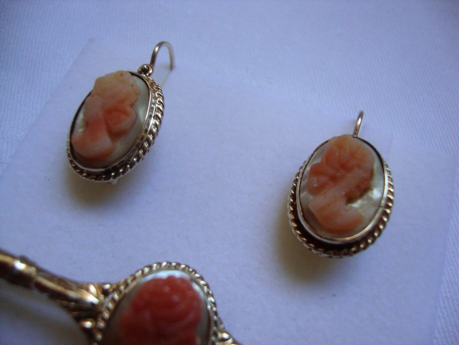 Vrlo lijepi starinski komplet naušnice i broš ukrašene ručno rezbarnim koraljem ađel skin bijelo crvenkasti na podlozi od sedefa