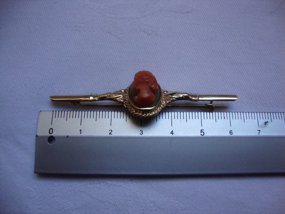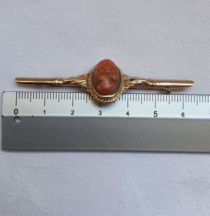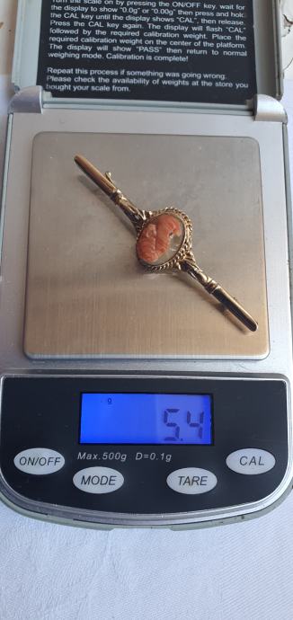 Broš dužine 6,4 cm x ovalni dio 1,2 cm x 2 cm ukrasnog dijela te ukupne težine 5,40 grama