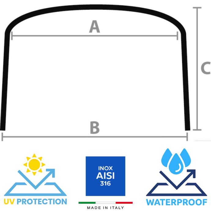 Opremljen cijevima Ø 25 mm i spojevima od nehrđajućeg čelika AISI 316. Sklopivi okviri, vodootporna i UV-otporna poliester/PVC tkanina, tamnoplava boja. Kutija uključena. Sklopivi i uklonjivi. Proizvedeno u Italiji.