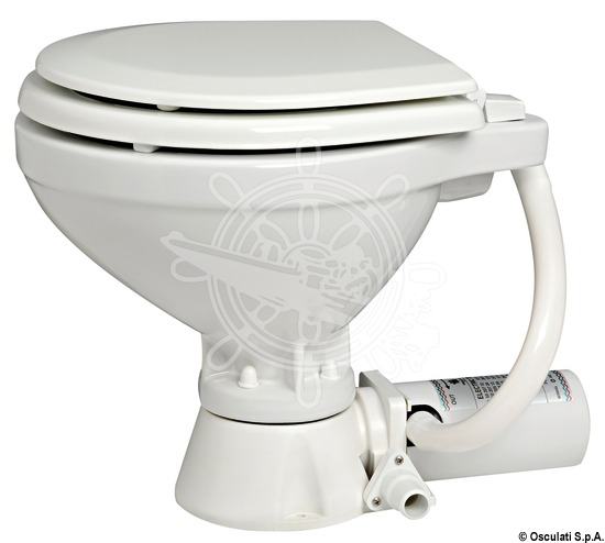 WC od bijelog porculana s pripadajućom wc daskom modernih linija, pumpom od bronze sa impelerom od neoprena.Motor sa trajnim magnetima i osovinom od inoxasa uljučenim maceratorom. Ulazna cijev od 1/2" i izlazna od 1", 12 V, 15 A, visina 350mm,širina 320mm,dubina 420mm. 5020712