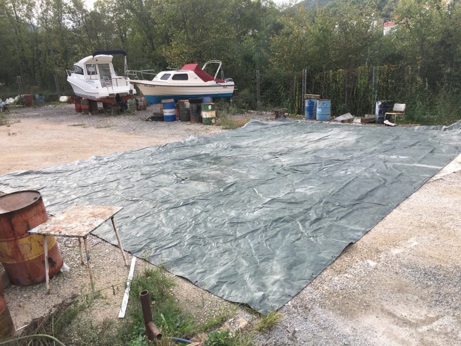 Veličina 10 x 15 metara. 100 % UV-otporna na vodu i na mraz. Ona je otporna 7 puta više nego normalna cerada. Stara je oko 17 godina i za ovu starost je još vrlo dobra. Za ovu dugo vrijeme ima samo nekoliko malih rupa. Vidite na slici. Materijal je jako robustan. Ja sam nju upotrebljavao kao ceradu (tenda) za barku. Cerada je još uvijek dobro upotrebljiva.