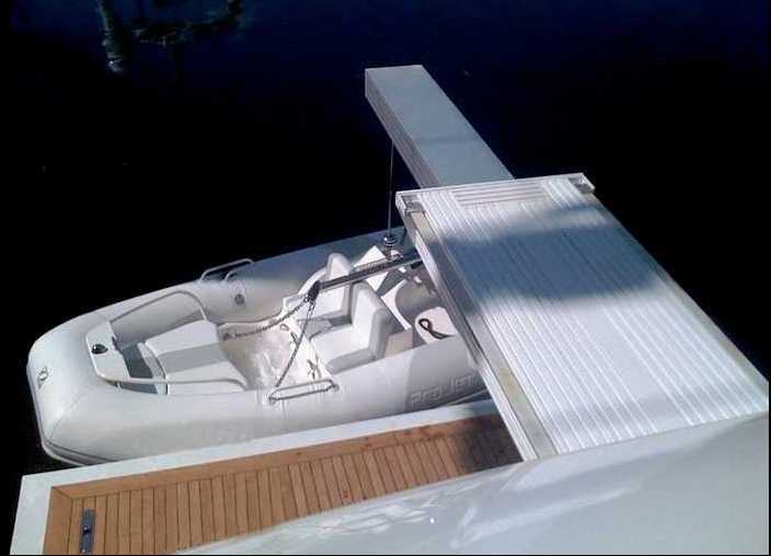 Lifting and translation system for tender. Composed by a primary structure with double beam that allows the lifting of tender with great dimensions, controlling at the same times the vertical encumbrance of the garage; while the second sliding element allows to carry the tender from the garage till under the bearing structure of the travel itself. The absence of electrical engines makes this structure suitable to be set in areas where it s possible the formationxplosive vapours. It could be built in stainless steel and/or light alloy in relation to the loads that have to be handled and to the working stroke.