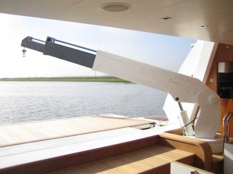 Davit for tender handling from the stern garage; characterized by an arm with double telescopic element, which allows to keep small size in closed position,allowing however a great extension with the load. The geometry of the davit, by keeping a great space under the arm, allows to handling a large tender and its generous sized allow the handling of high load.
