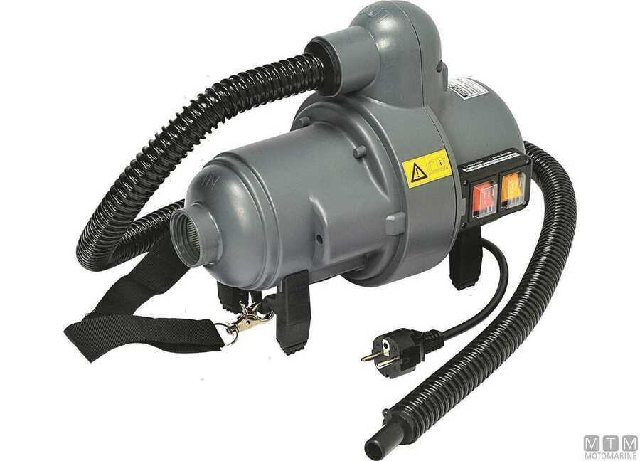 Električna pumpa 220V velike brzine opremljena dodatnim motorom za pojačanje kapaciteta i pritiska za napuhavanje ili ispuhavanje bilo kojeg gumenjaka i predmeta na napuhavanje u kratkom vremenu. Opremljena zaštitnim osiguračem, adapterima za ventile i 3-metarskim kabelom za napajanje. Potrošnja 1000W (2000W s boosterom). Dimenzije 32 x 17 x V26 cm.