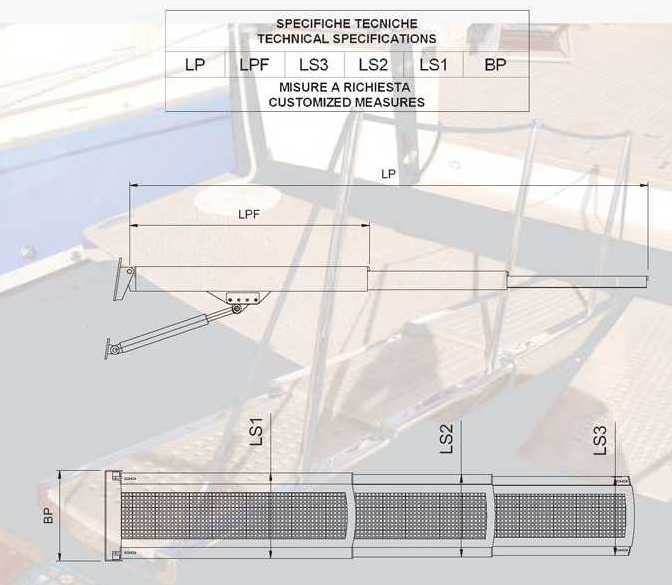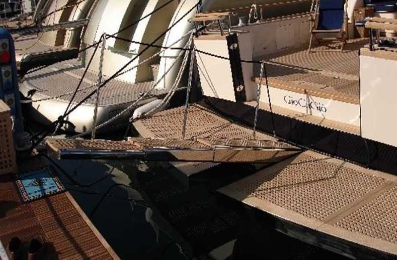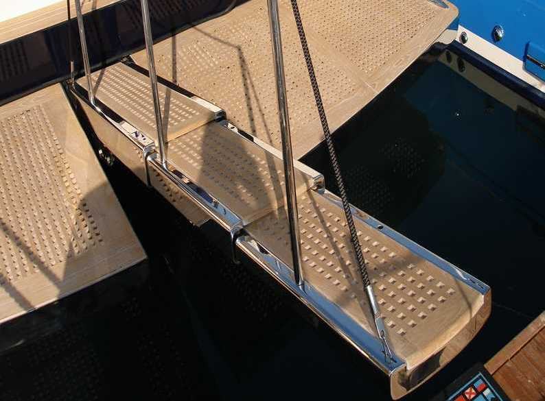 ART. 24GE EXTERNAL GEMINI GANGWAY External telescopic gangway in two or three sides mod.Gemini, full hydraulic, built in stainless steel with staircarpet in teak. Complete of a manual stanchions line, hydraulic and electronic central system, two remote controls, one manual control. On request it s possible to customize the gangway to adapted it to the characteristics of the boat and it is also possible to equippe it with optical fibres.