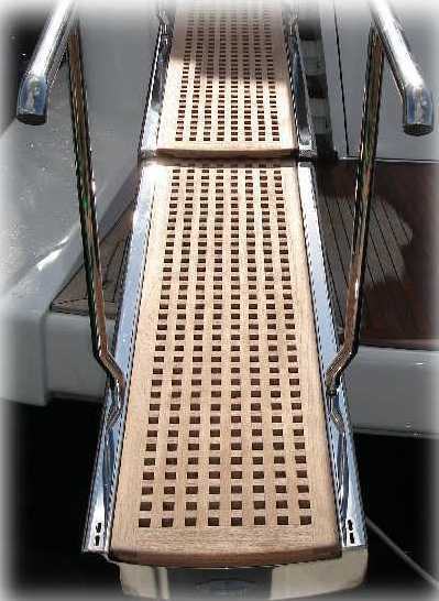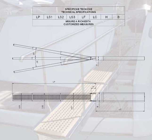 Gangway, model Gemini Special, built in polished stainless steel, contained in astainless steel box as supporting structure. it s planed for large size boats, built from a minim lenght of 5000 mm. and it allows the raising of static loads up to 200 kg. on is top. The gangway is furnished with a double row of manual stanchions, hydraulic pump with manual device for emergency, 1 electronic box, 2 remote controls and 1 manual controls. By request equipped with optical fibres.
