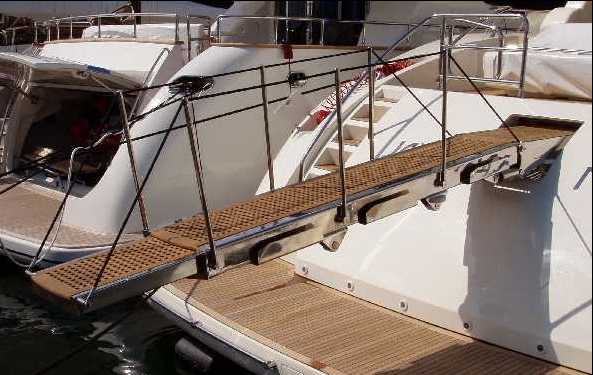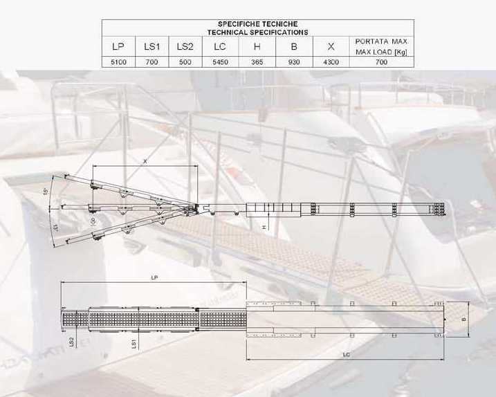 Large sizes gangway-davit in two sides, re-entering in an auto-supporting box. It is fully hydraulic, built in stainless steel with staircarpet in teak and automatic stanchions. It consents lifting and movement of loads up to 700 kg. an hydraulic windlass consents vertical translation of the lifting hook for an easy movement of the load. Standard equipments: Orion gangway is furnished with hydraulic pump, electronic box with a manual control and a remote control. The electronic box is programmed for a complete automation and control of all movements. By request equipped with optical fibres.