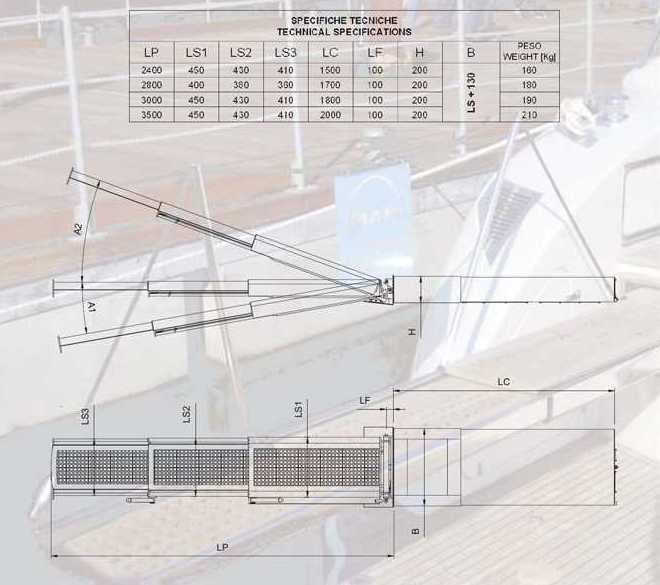 PIN-CRAFT ART.26SC3 SCORPION PLUS GANGWAY 3 SIDES Gangway model §Scorpion§ full hydraulic, built in stainless steel in three sides with staircarpet in teak. Contained in a stainless steel box. The alignment and the stanchions meaning are automatic. Complete of hydraulic and electronic central system (12/24V.), a remote control and one manual control. On request equipped with optical fibres.