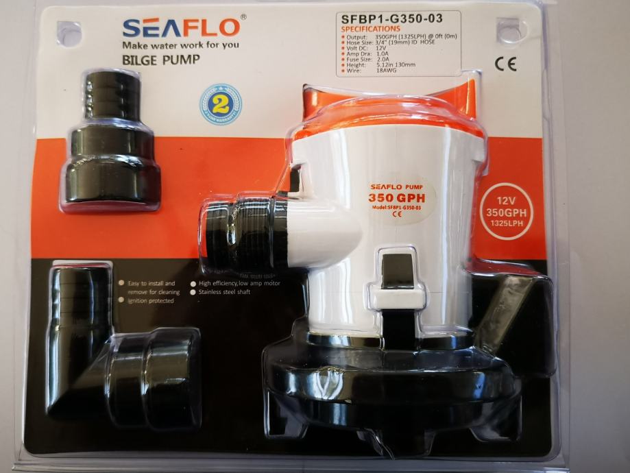 Prodaje se potopna kaljužna pumpa SeaFlo 12V, 22 l/min, otvor ø 20 mm, sa setom priključaka od 19 mm (3/4"). Napravljena od materijala otpornih na koroziju, lako rastavljiva radi čišćenja.