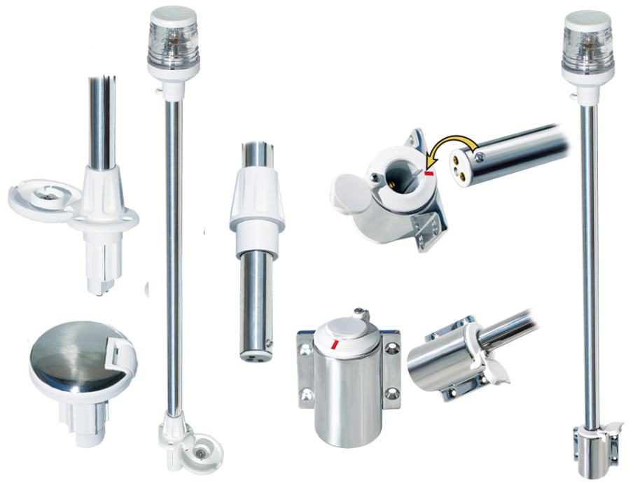 Uklonjivo svjetlo na stupu s osovinom inoxa i bijelim plastičnim dijelovima, zajedno sa signalnim svjetlom od 360° i držačem zastavice.