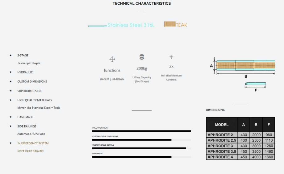 High aesthetics, first-rate manufacture quality and functionalism are perfectly combined in this handmade, totally hydraulic gangway made of mirror-like stainless steel. It is provided from 2 up to 4 meters length, but also in custom dimensions according to your yacht’s needs. This gangway is telescopic in 3 stages, completely remote controlled, it has stable control panel and manual control system for emergency use (extra upon request).