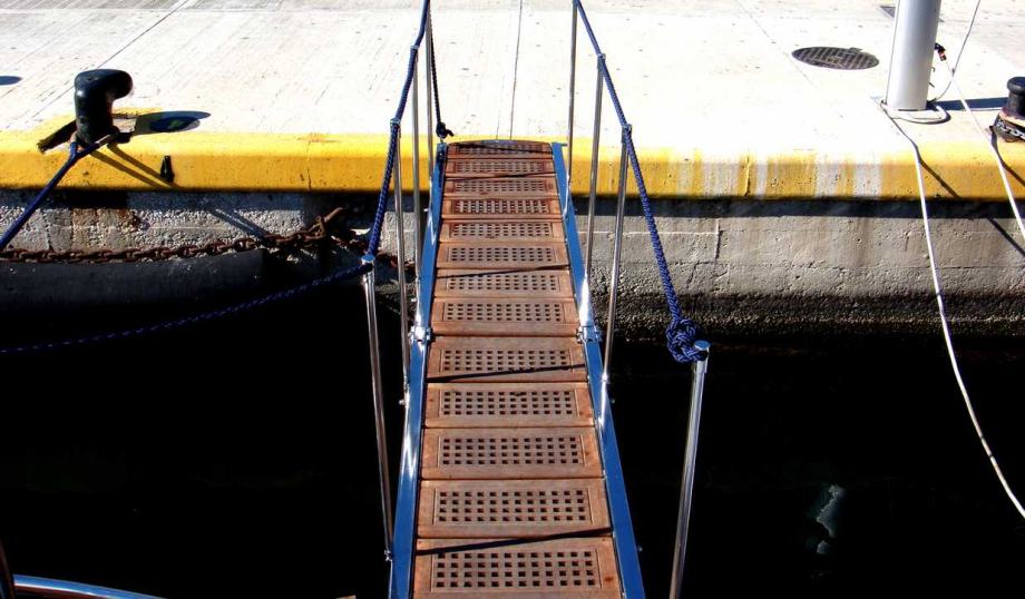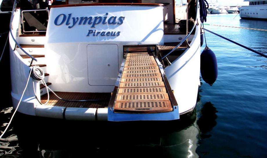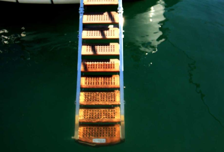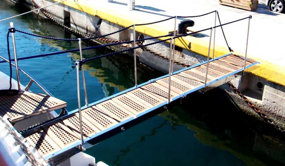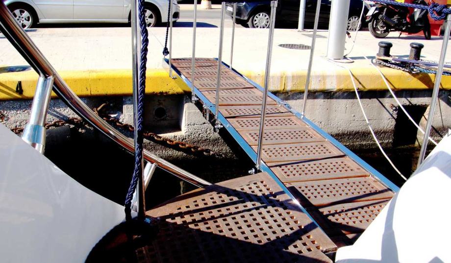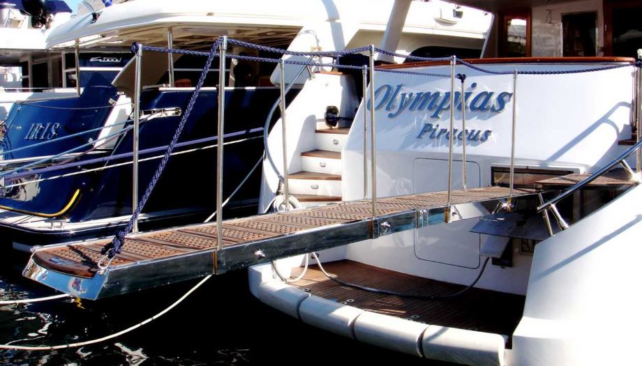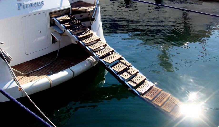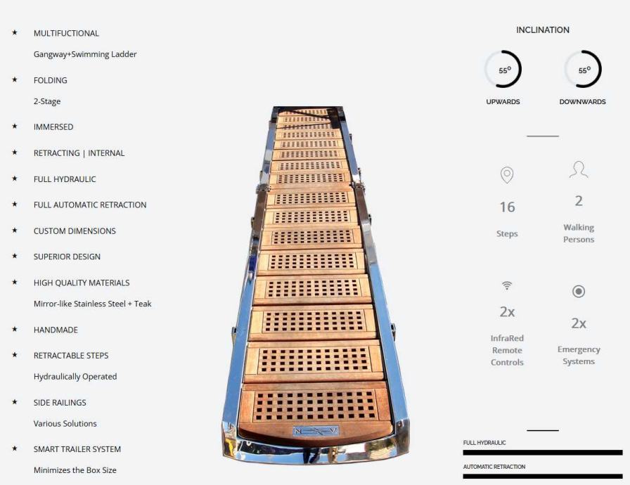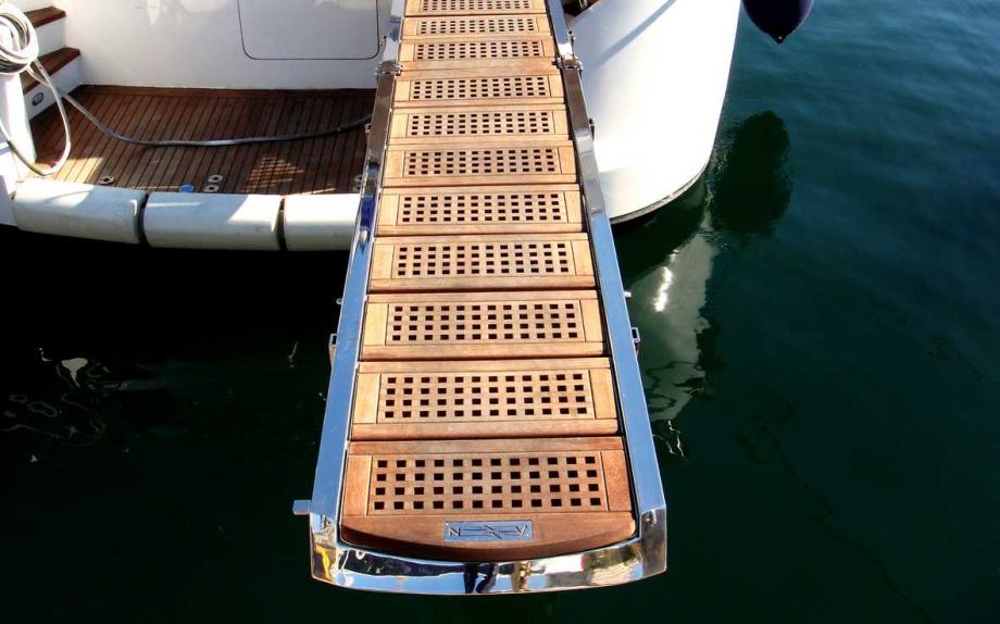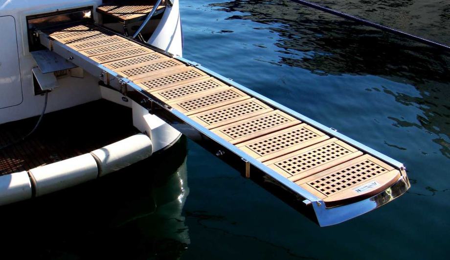 Folding hydraulic gangway 4m length + 0.70m width made of mirror-like stainless steel with hydraulically operated retractable teak steps that transform the Gangway into immersed Luxury Swimming Ladder.