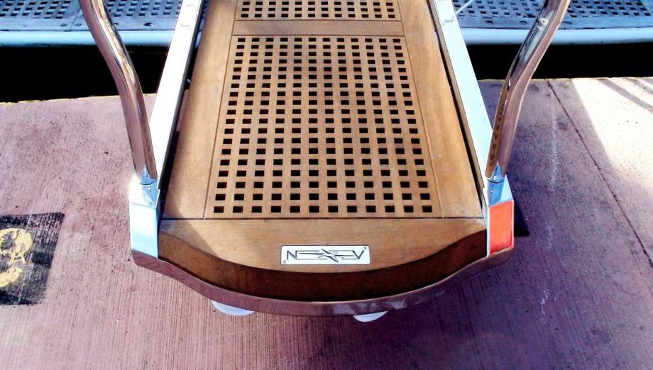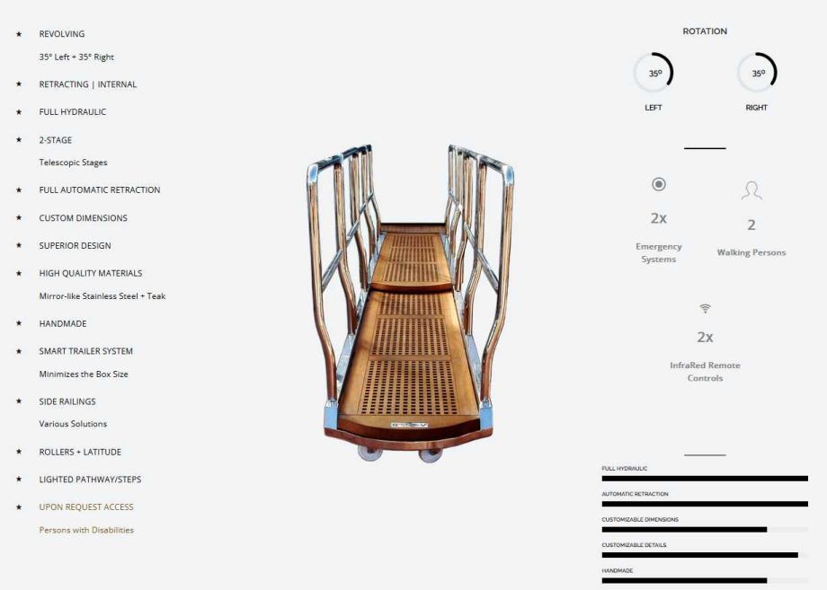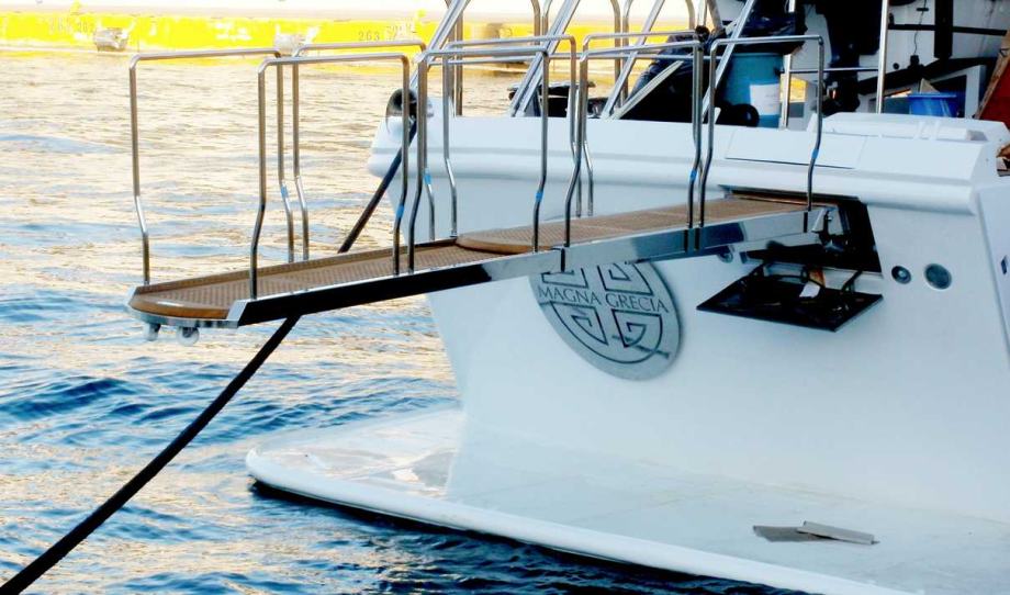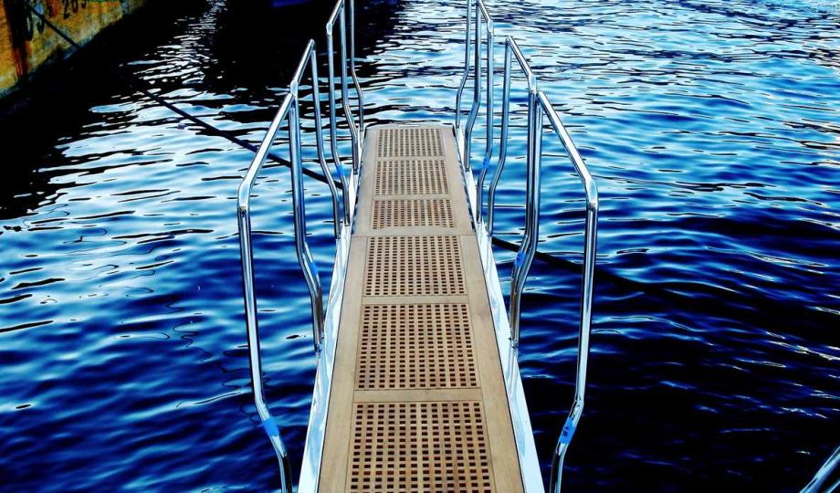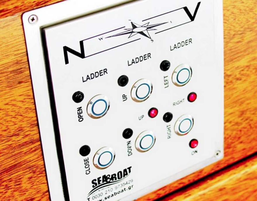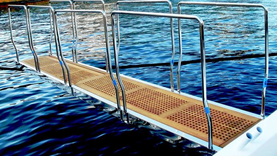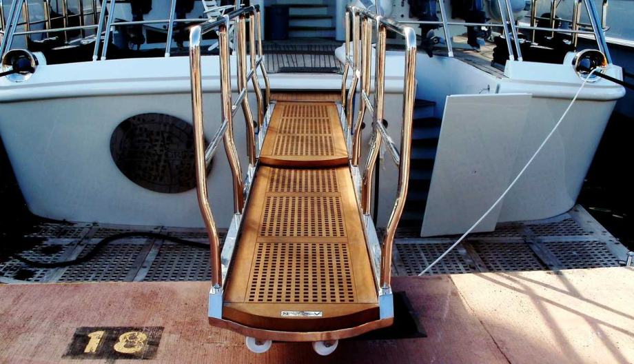 Revolving hydraulic gangway 5.5m made of stainless steel and teak. With special constructed railings designed to allow the full gangway’s width use and to suit with the yacht’s aesthetics.