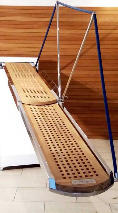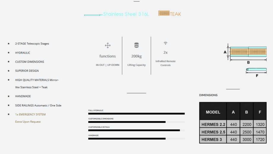 High aesthetics, first-rate manufacture quality and functionalism are perfectly combined in this handmade, totally hydraulic gangway made of mirror-like stainless steel. It is provided from 2.2 up to 3 meters length, but also in custom dimensions according to your yacht’s needs. This gangway is telescopic in 2 stages, completely remote controlled, it has stable control panel and manual control system for emergency use (extra upon request).