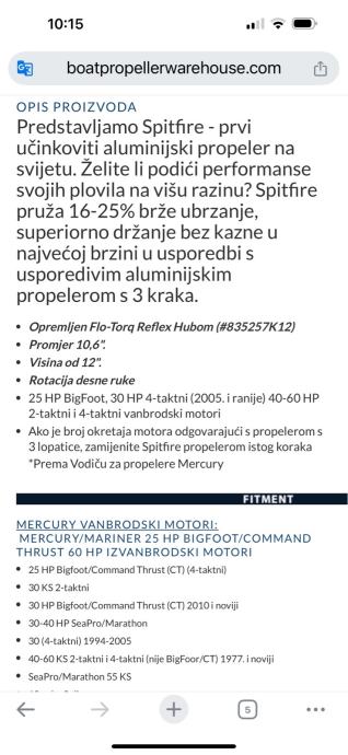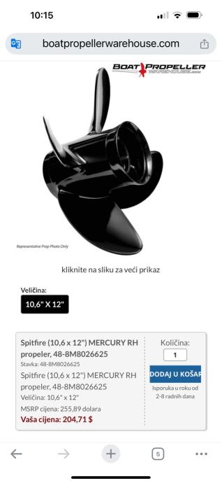 Prodajem potpuno NOVI orginalni propeler MERCURY 10,6x12. Propeler je došao uz novi motor MERCURY 60 ks ali taj propeler ne odgovora za moje plovilo. Propeler je NOV. Propeler je namjenjen za motore od 25 ks do 60 ks. (MERCURY, TOHATSU, EVINRUDE, Jonhnson)