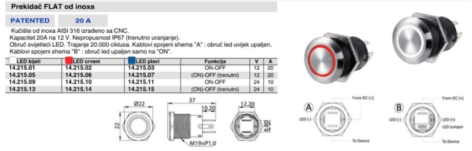Push prekidač FLAT od inoxa LED crveni ON-OFF 12V 20A IP67