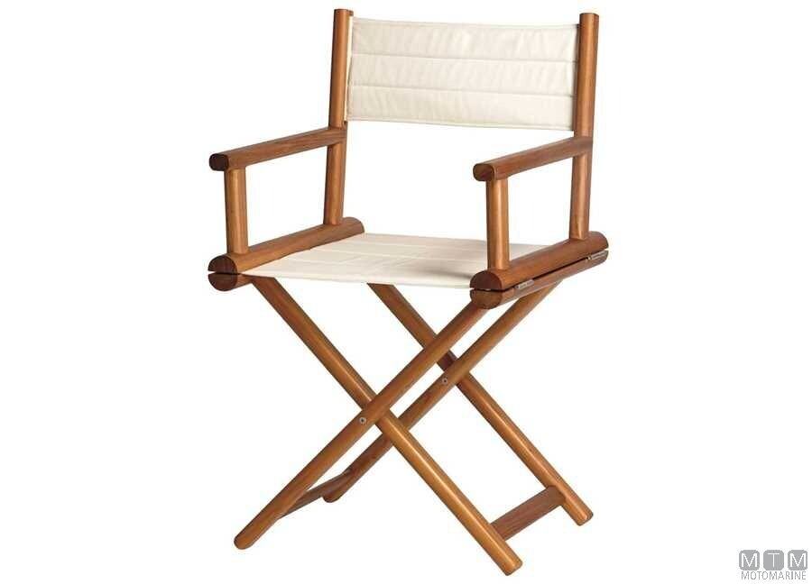 Sklopiva stolica "režiser" od posebno obrađene Tikovine Marine Business otporne na UV zrake i na morske uvjete. Željezarija i vijci od Nehrđajućeg Čelika. Olefin tkanina otporna na rascjepe, sunce i morsku okolinu.