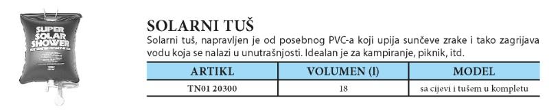 Solarni tuš je napravljen od posebnog PVC da upija sunčevu toplinu i zagrijava vodu u spremniku. Idealan je za plovila, kampere i šatore.
