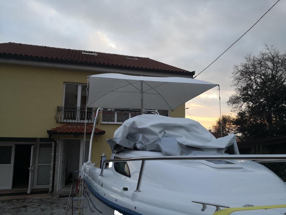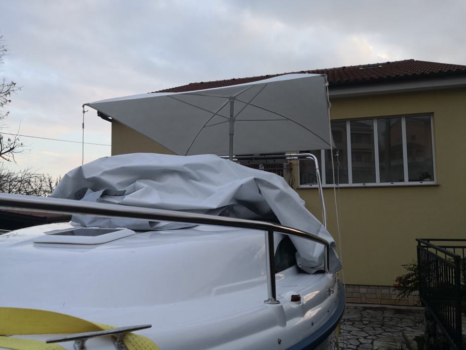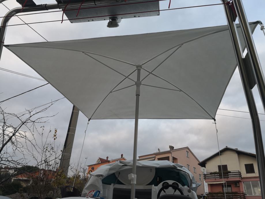 Povoljno prodajem suncobran za brodice TESSILMARE SOLBRELLO (Osculati code: 46.890.00). Kvadratni oblik sjenila. Dimenzije - kad je sjenilo otvoreno: 200 x 200 cm, Visina se može podesiti. Dimenzije - kad je zatvoren: 160 x 10 cm. Gornji i donji dio mogu se rastavit što omogućava lakše spremanje kad nije u upotrebi. Suncobran je kao nov - bez oštećenja jer je vrlo malo korišten. Izrađen je od kvalitetnih materijala. Nosač suncobrana je ručno napravljen od inoxa i prilagođen suncobranu te se lako može ugraditi na bilo koju ravnu podlogu. Cjena kompleta je: 100 eura. Kontakt mobitel: 0959002855. Lokacija: Kastav.