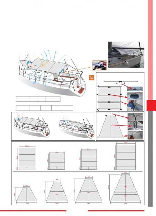 JOS tende su lagane te se mogu jednostavno montirati u nekoliko minuta pomoću cijevi koje dolaze u kompletu. Tendu možemo dodatno učvrstiti na ogradu broda pomoću elastične užadi koja je također dio opreme koja dolazi sa tendom. Dostupne u 8 različitih dimenzija i sivo/plavoj kombinaciji boja.