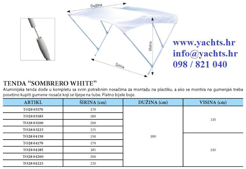 Aluminijska tenda dođe u kompletu sa svim potrebnim nosačima za montažu na plastiku. Ako se montira na gumenjak potrebno je kupiti gumene nosače koje se lijepe na tube. Platno je bijele boje.