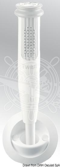 Revolucionarna i inovativna, regulacija hladana/topla voda i regulacija ja?ine mlaza postiže se okretanjem doljnjeg dijela tijela tuša na vrlo jednostavan i intuitivan na?in. Visoki doseg (8 lt/min) osigurava snažan mlaz vode. Tijelo od ABS-a i rubovi od sive gume (po upitu i plave boje) radi zaštite palube od iznenadnih udaraca. Cijev dužine 2,5 mt (po upitu raspoloživa i sa cijevi dužine 4 mt). Jednostavno instaliranje: - cijev specijalnog presjeka sa T priklju?kom i ve? postoje?im brzim spojevima; - mogu?nost instaliranja flan?e izvana i pomo?u samo jednog okruglog otvora.