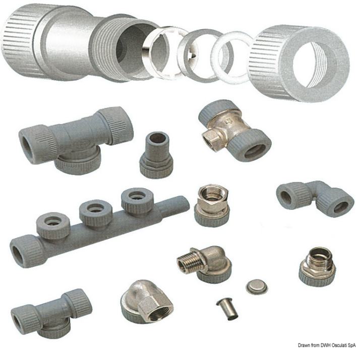 Montiranje trenutno na pritisak. Dovoljan je jednostavan pritisak cijevi na priključak za njegovu montažu. Svaki priključak može se ponovno koristiti. Priključci su od poliamida a cijevi od polietilena. Diametar vanjski mm 15, minimalna zakrivljenost mm 120. Priključci sa odobrenjem RINA sa certifikatom MAC/119897/1TO/98.