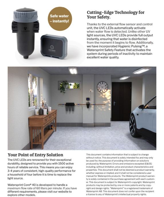 Sustav za dezinfekciju vode Watersprint Core® je spreman za ugradnju na dovod vode osigurati pitka voda svježeg okusa u cijeloj vašoj objekt. To je dezinfekcija vode u cijeloj kući sustav koji osigurava mikrobno ispravnu vodu na sve otvore za vodu u vašem domu izlažući ulaznu vodu na UVC svjetlo, dokazana tehnologija za inaktivaciju virusa, bakterija i patogena.