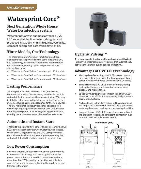 Vodeni otisak Core® je naša najnaprednija UVC LED voda sustav za dezinfekciju, dizajniran i proizveden u Švedska s visokom kvalitetom, svestranošću, kompaktnošću dizajn i isplativost na umu.