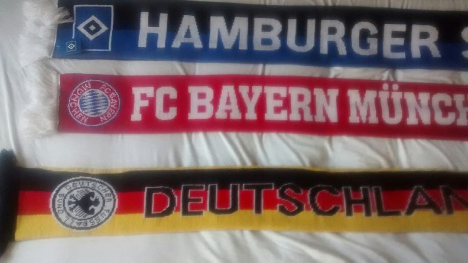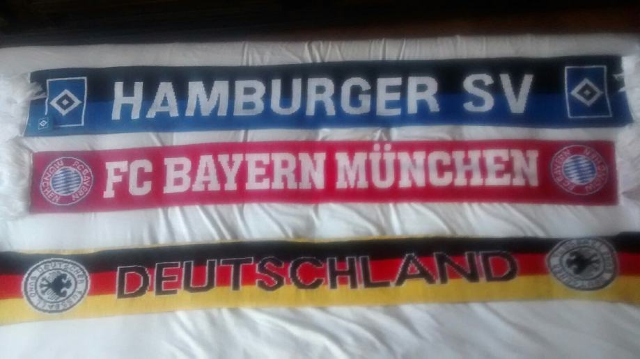 Šalovi HSV-a iz Hamburga ( novi, sponzorski natpis Fürth s druge strane) za 10€, FC Bayern Minhen za 9€ i Njemačka reprezentacija za 8€ . Sva tri zajedno za 25€+ dostava. Moguća zamjena za dres NK Rijeke ili šalove Armade, Orijenta ili Rijeke. Ili za Star wars ili Harry Potter stvarčice.