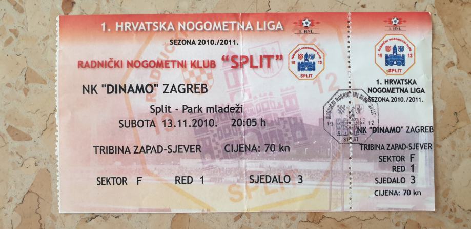 Nepocijepana ulaznica HNL 2010/11 RNK Split NK Dinamo 0:1 (gol Adrian Calello 52').