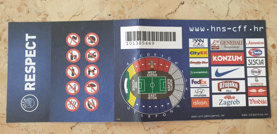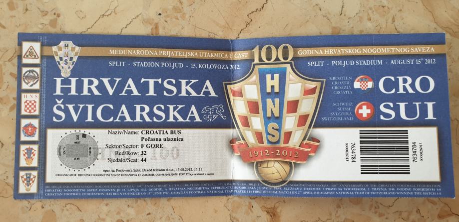 Nepocijepana ulaznica Hrvatska-Švicarska u čast 100g. HNS-a koju je reprezentacija Hrvatske izgubila sa 2:4 a odigrana je na stadionu HNK Hajduka 13.08.2012g.