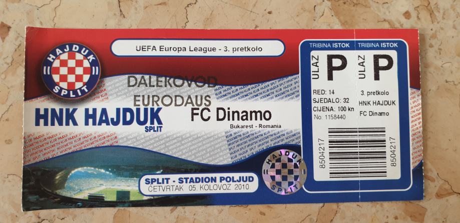 Nepocijepana ulaznica uzvratne utakmice 3 pretkola UEFA Liga Kupa Hajduk-Dinamo Bukarest odigrane 05.08.2010 na stadionu Poljud pred 28000 gledatelja gdje je Hajduk sjajnom predstavom nadoknadio zaostatak iz prve utakmice u Bukureštu od 0:1 i pobjedom od 3:0 golovima Ante Vukušića u 12',Mario Brkljače 22' i Marina Tomasova u 38' , se plasirao u nastavak UEFA Kupa.