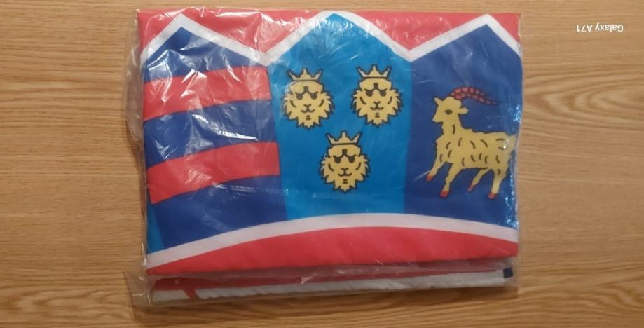 S obje strane ima šivani grb, otvor za štap promjera 5 cm te našivenu trobojnicu promjera 6 mm.