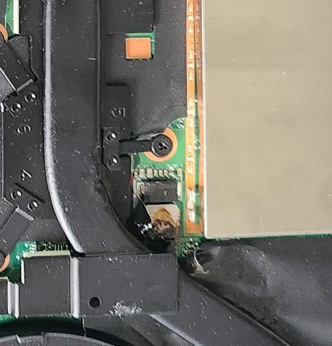 Nažalost, GPU čip ili tranzistor na matičnoj ploči doživio je kratki spoj (vidi se na slici), što je laptop učinilo neupotrebljivim. Međutim, svaka druga komponenta ostala je u odličnom stanju. Nakon što sam dobio ponudu za popravak u iznosu od 700 € za zamjenu matične ploče, odlučio sam se rastati s njom umjesto daljnjeg ulaganja.