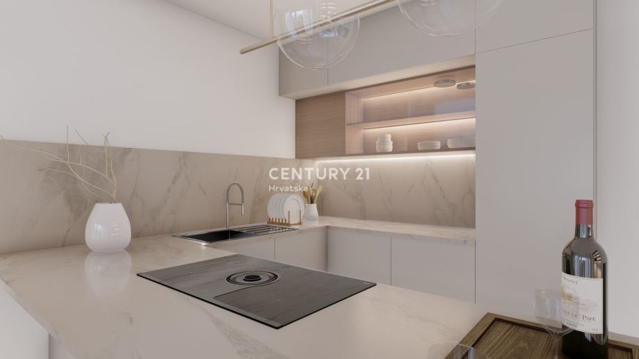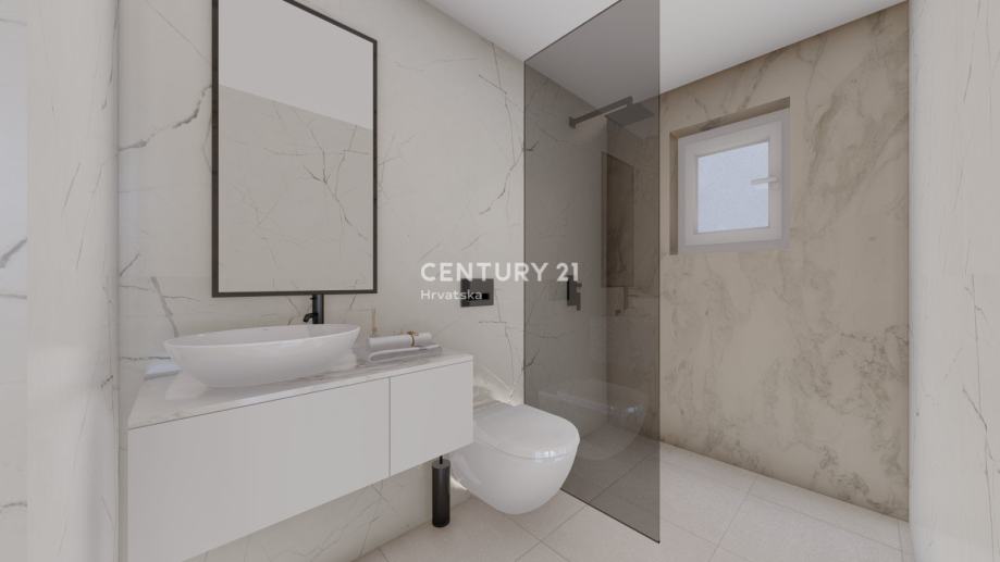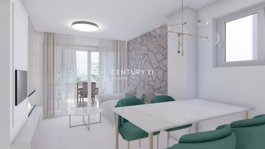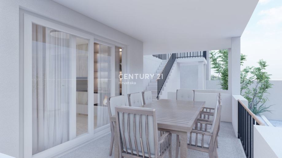 Prizemlje se sastoji od velikog dnevnog boravka sa blagovaonom i kuhinjom, spavaće sobe, velike terase, kupatila i wc-a.