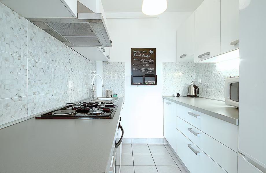 * Kuhinja: Potpuno opremljena (perilica suđa, hladnjak/zamrzivač, ploča za kuhanje s pećnicom, napa, mikrovalna pećnica, aparat za kavu, kompletno suđe).
