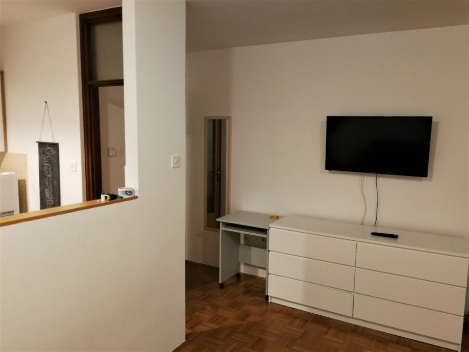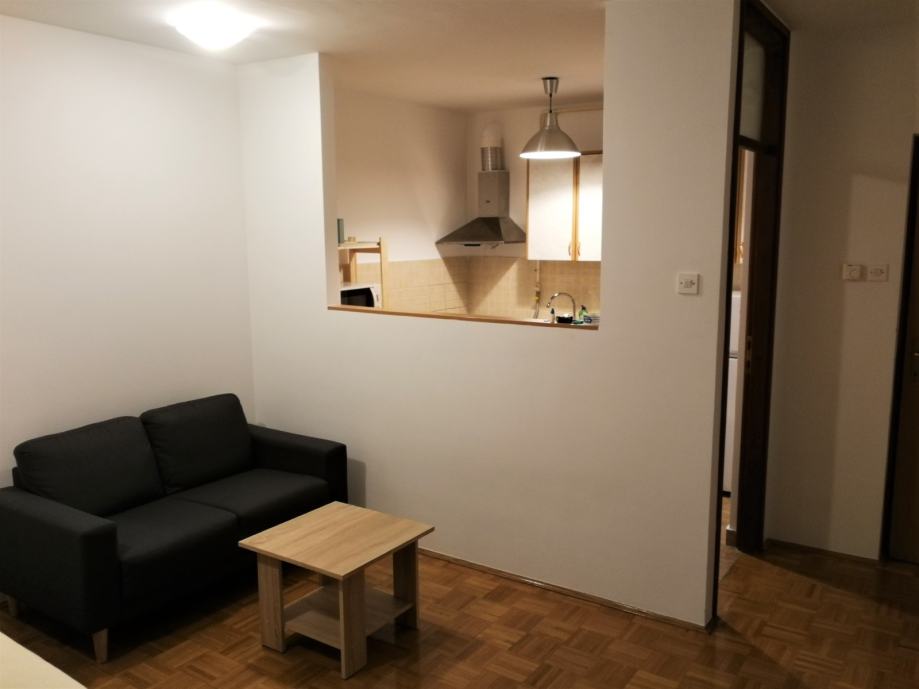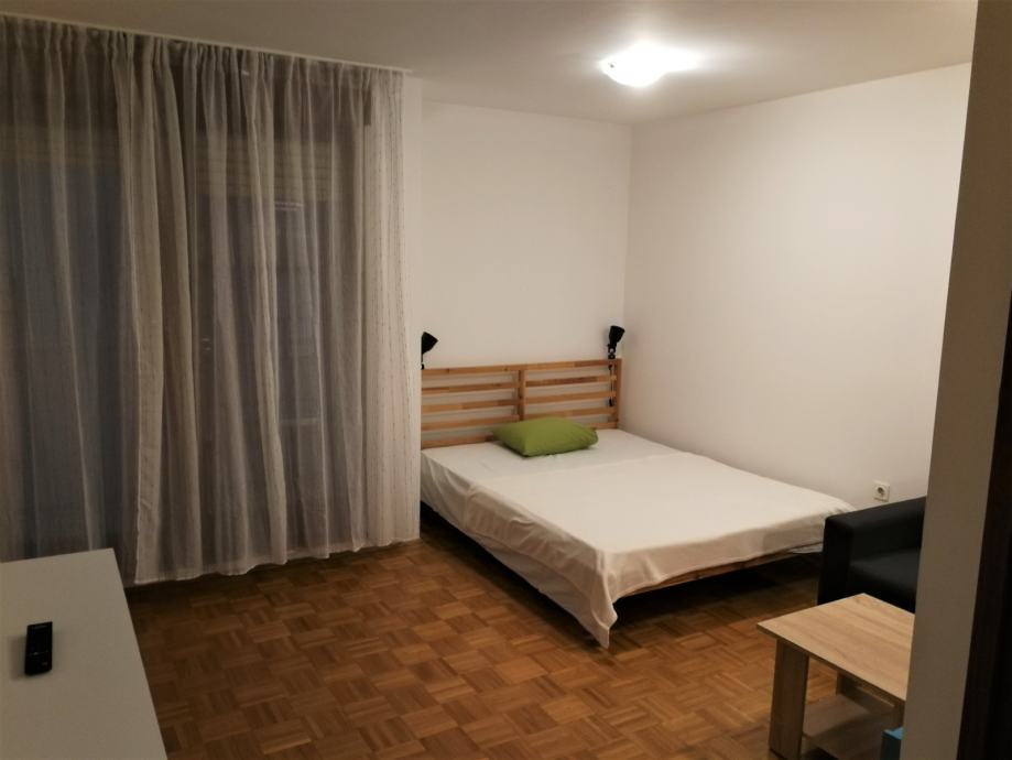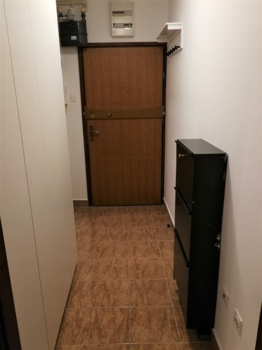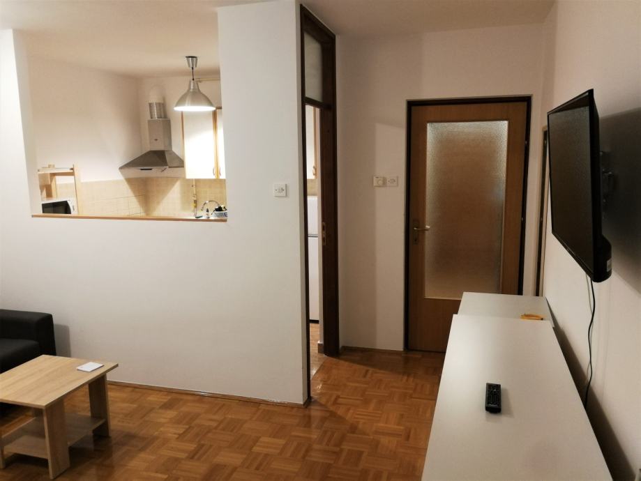 Stan se sastoji od ulaznog prostora, dnevne sobe sa spavaćim dijelom, kuhinje, kupaonice s WC-om i balkona i prodaje se namješten - krevet, kauč, komoda, LED TV 100cm, u kuhinji štednjak (plin i struja), frižider i mikrovalna, u kupaonici perilica rublja, u hodniku veliki ormar izrađen po mjeri, protuprovalna vrata, klima. Uz stan ide i spremište na 5. katu.