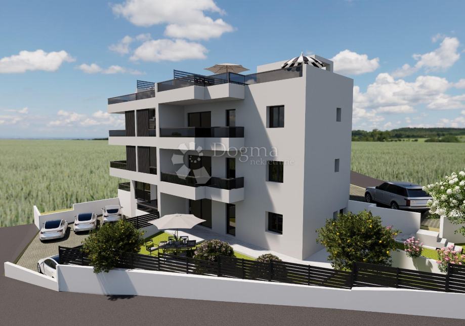 U novoizgrađenoj stambenoj zgradi prodaje se moderan stan S6 smješten na drugom katu, udaljen svega 150 m od mora. Stan je odmah useljiv – svi priključci, instalacije i oprema su u potpunosti dovršeni. Uz stan dolazi i krovna terasa koja pruža prekrasan pogled na more.