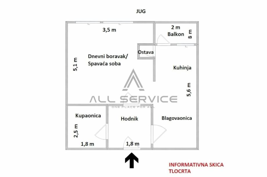 Raspored: Ulazni hodnik, prostrana kuhinja s blagovaonicom i izlazom na balkon (ložu), jedna velika soba, plus spremište (ostava) u podrumu zgrade za dodatni prostor.