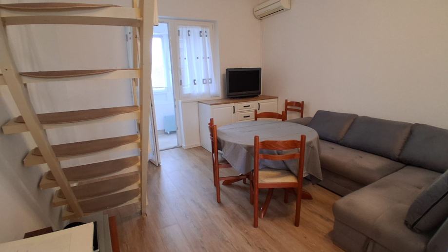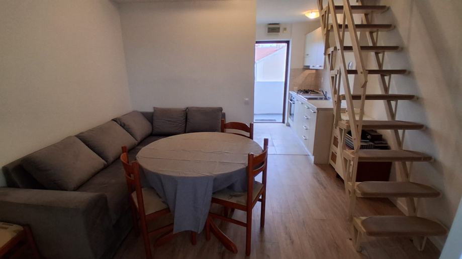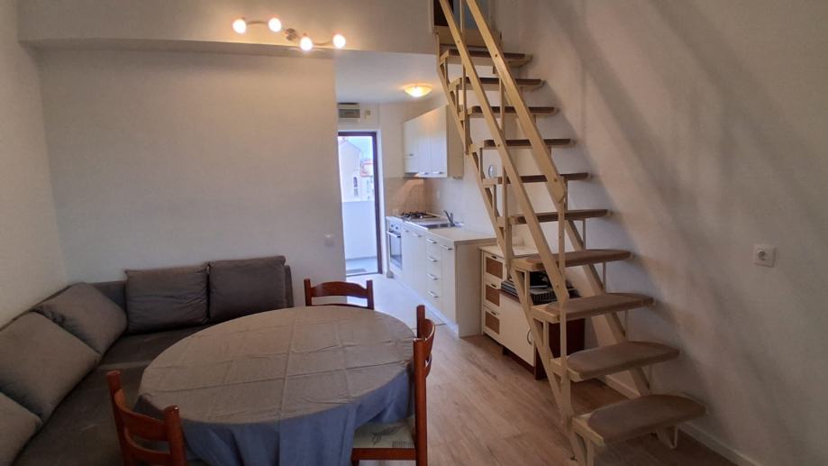 Prodaje se dvoetažni jednosoban , 1s stan od 38 m2 nalazi se na 3. katu zgrade. Sastoji se od hodnika, kupaone, dnevnog boravka, kuhinje, blagovaone, balkona i spavaće sobe u visokom potrovlju. Udaljen je od mora 150 m.