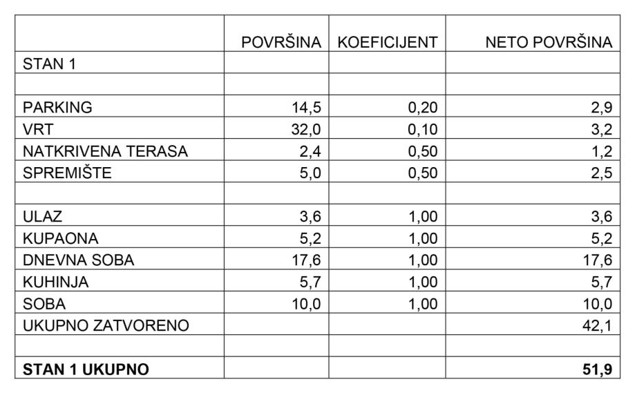 Nalazi se u visokom prizemlju urbane vile sa ukupno dva stana. Sastoji se od: ulaza, kupaone, dnevne sobe, kuhinje i spavaće sobe ili varijanta sa dvije spavaće sobe. Pripada mu vanjski parking, terasa, dvorište/vrt i spremište. Kupac u ranijoj fazi izgradnje može birati varijantu sa jednom ili dvije spavaće sobe, te interijerske preinake i materijale.