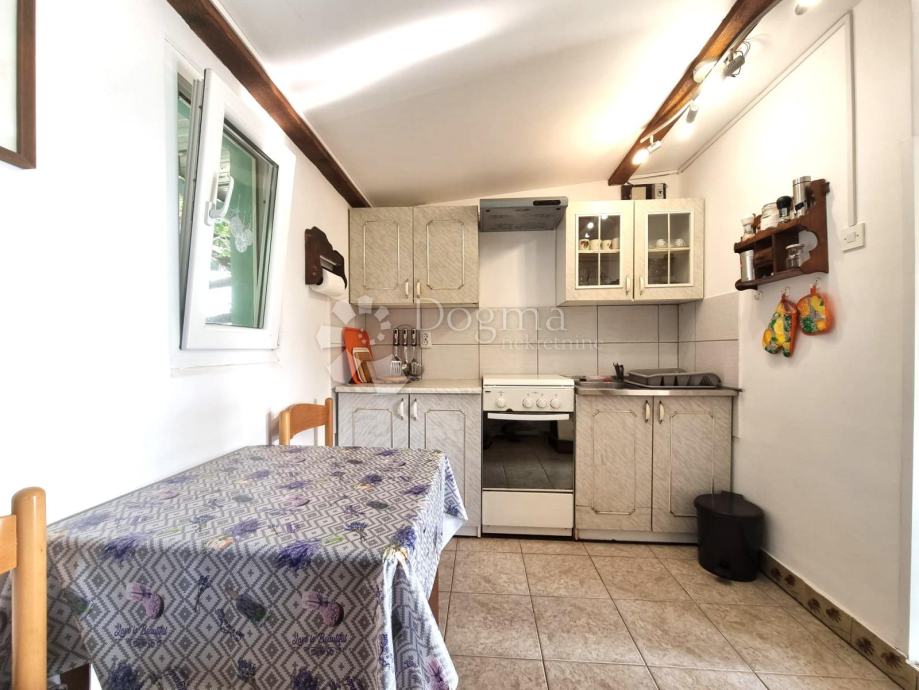 Veća kuća se sastoji od podruma, hodnika, ostave. dnevnog boravka s blagovaonicom, kuhinjom, jednom spavaćom sobom te kupaonicom. Površina kuće je 60m2 te sa strane ima i veliku terasu od preko 20m2 koja se može po potrebi i zatvoriti.