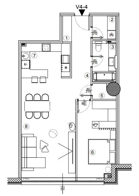 Ulazni prostor, ostava, kupaonica, kuhinja, blagovaonica i dnevni boravak, spavaća soba s garderobom.