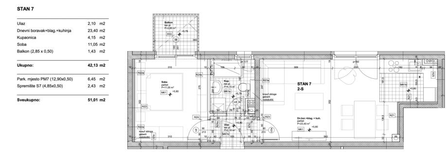 Prodaje se dvosoban stan (Stan 7) u novogradnji na adresi, smješten na višem katu moderne stambene zgrade. Stan ima balkon te pripadajuće parkirno mjesto i spremište. Ukupna obračunska netto površina iznosi **51,01 m²**.
